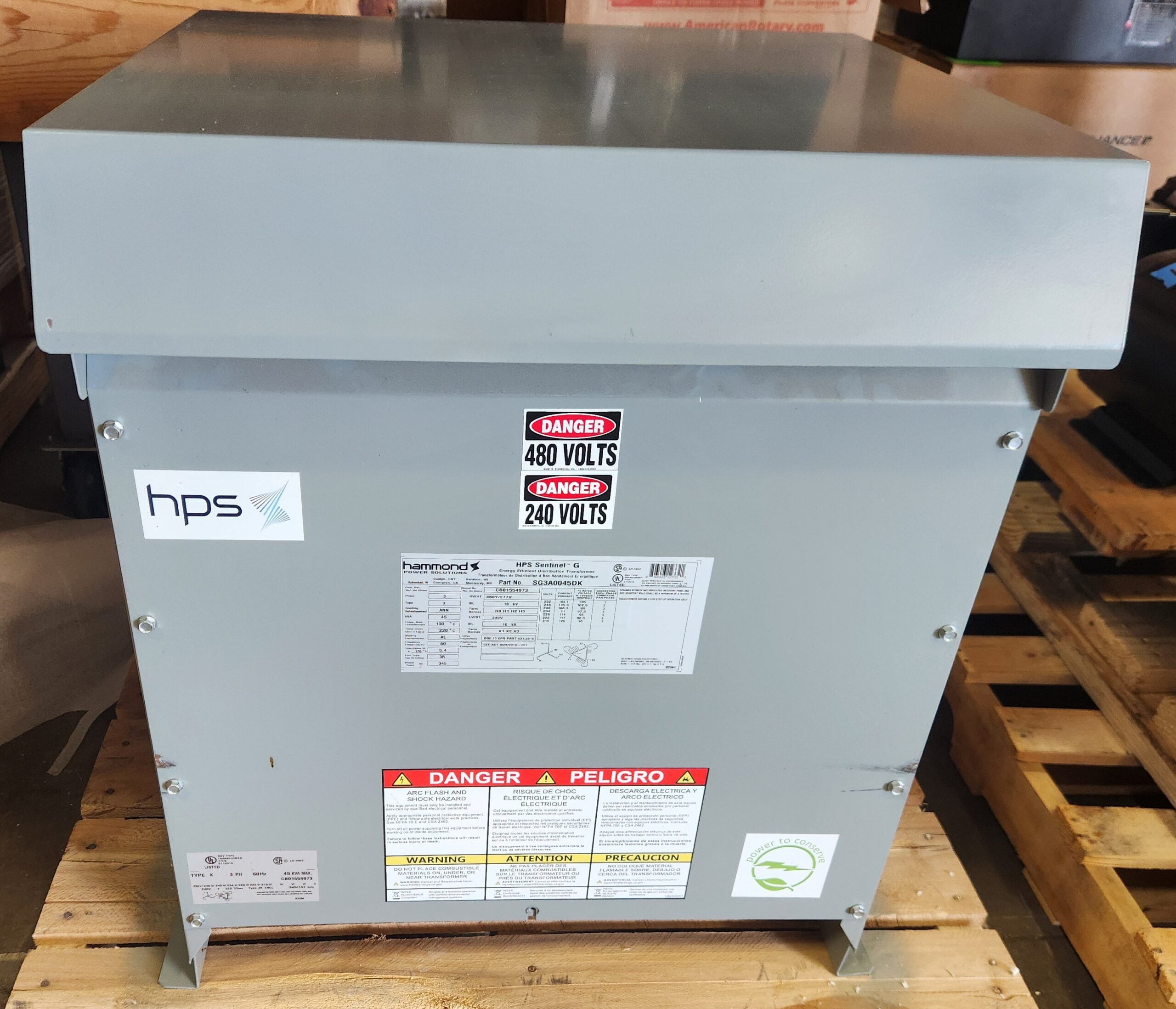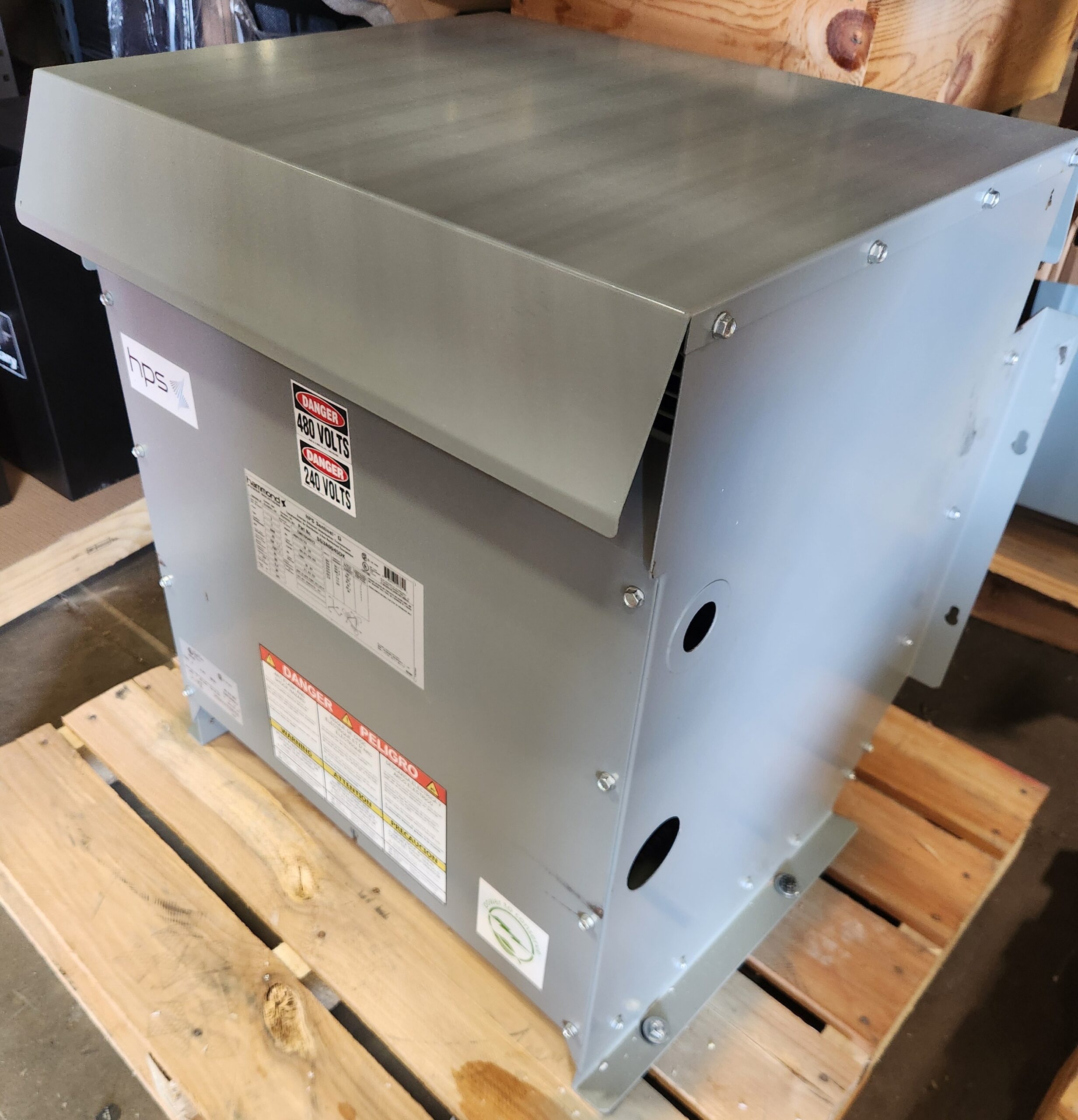 The TFHAMSG3A0045DK transformer is a three phase 240-480V isolation-transformer. This transformer will provide voltage tap options at 240 between 480v . This transformer will allow you to go delta to delta, wye to wye, or delta to wye on your power conditions. This is a scratch and dent unit that has a dent on the corner of the top cover of the unit and some scratches/chips in the paint.